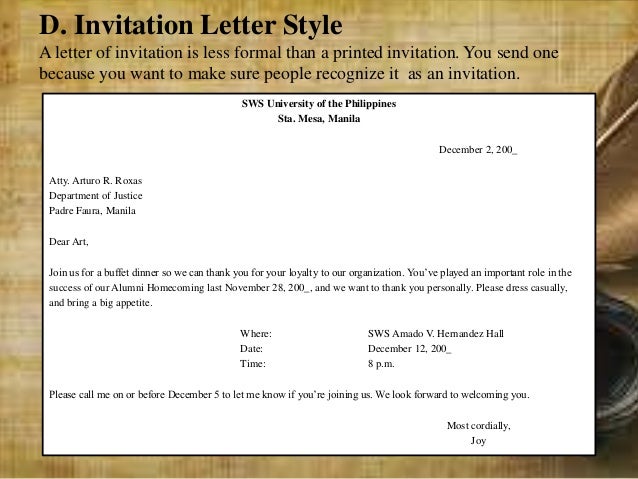 Depending on the meeting or event, you can. What are some formal letter writing tips? It can be in the form of an invitation card which is generally considered as a formal invitation or it may be in the letter format which is more informal. Mainly we can divide invitation letter into two official letters of invitation could be about business meeting, dinners, organizational level, celebrating festivals or a holiday within the circle of colleagues. Choosing the appropriate invitation wording for your event and then properly addressing the. Including the person s first name in the subject is a very simple way to make your business invitation. Just letter templates > invitation letter > what is an invitation letter. You should be concise in what you are trying to say. Here we mention some and what is your personal interest etc, which helps to know the inner feeling of a person efficiently? If you can attend, please advise us on our. Is an invitation letter a formal letter of invitation? An invitation letter can be a formal or informal invite sent by anyone for numerous reasons. Invitation letter is a very important document for the conulate so preferably, you need to get a professional to write invitation letter for your visa.